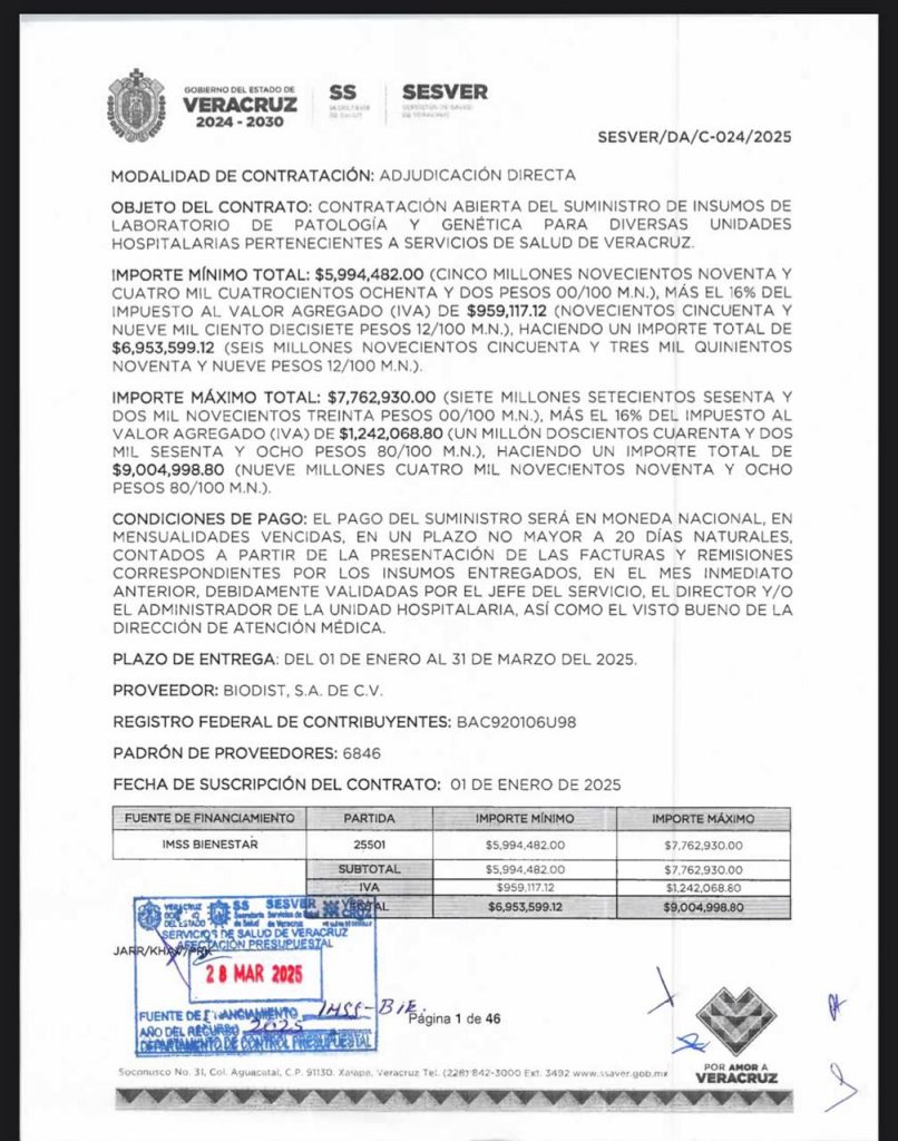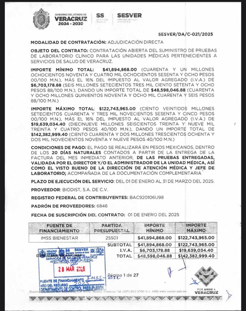 En ese 2023, la empresa recibió al menos dos contratos para el suministro de pruebas de laboratorio clínico en los Servicios de Salud de Veracruz: SESVER/DA/C-001/2023, por 136 millones 751 mil 657 pesos con 60 centavos, para el primer trimestre de ese año, y el SESVER/DA/C-055/2023, por 348 millones 74 mil 782 pesos con 88 centavos, lo que da un total de 484 millones 826 mil pesos.
