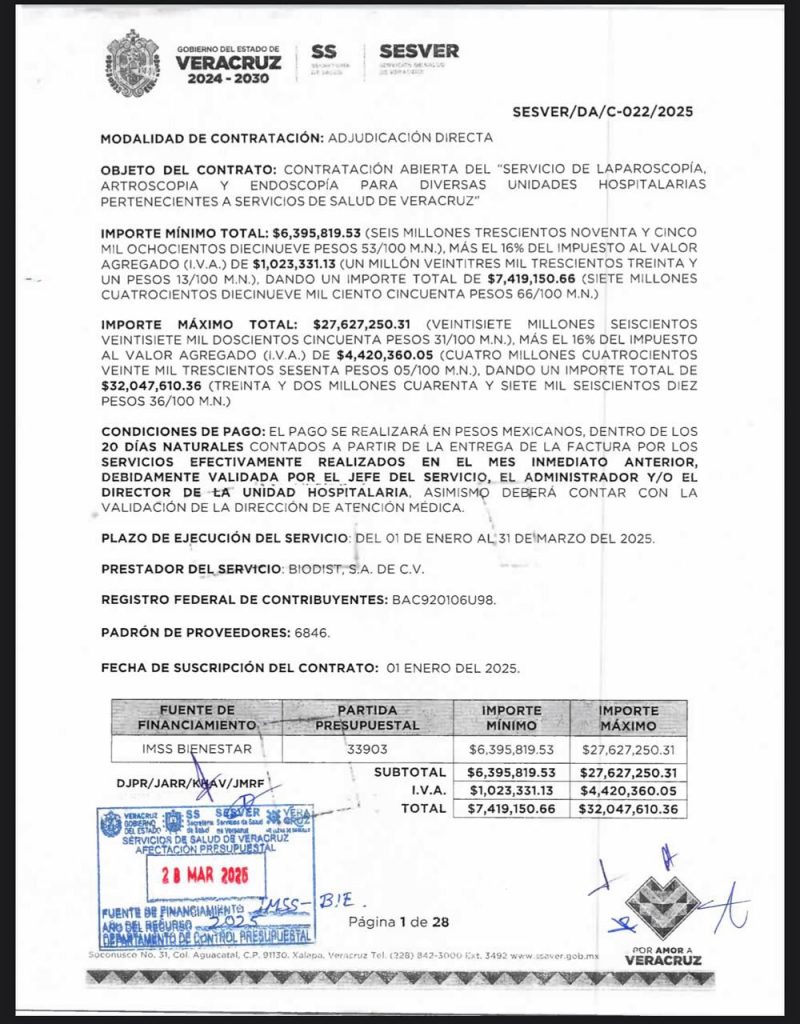 2. El SESVER/DA/C-022/2025, por 32 millones 47 mil 610 pesos con 36 centavos, por “servicio de laparoscopía, artroscopía y endoscopía para diversas unidades hospitalarias” de Sesver
